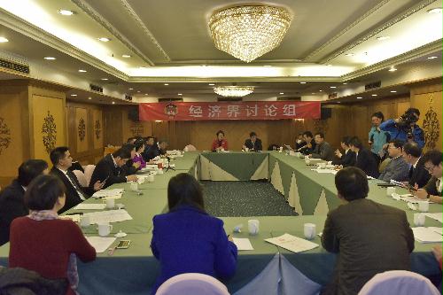 图为区委副书记、区政府区长丁晓芳听取经济界别组讨论情况。
